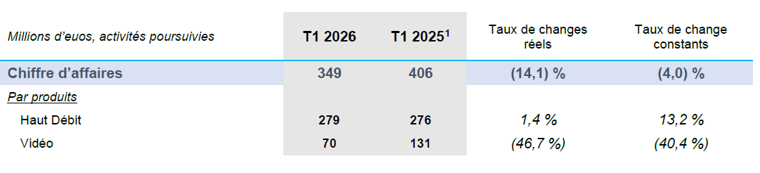 • Les revenus Broadband ont progressé de 1,4 % (+13,2 % à taux de change constants), tandis que les revenus Vidéo ont reculé de 46,7 % (-40,4 % à taux de change constants).